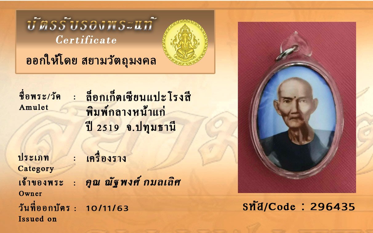 รหัสสินค้า : 296435 ล็อกเก็ตเซียนแปะโรงสีพิมพ์กลางหน้าแก่ ปีพศ 2519 จังหวัดปทุมธานี