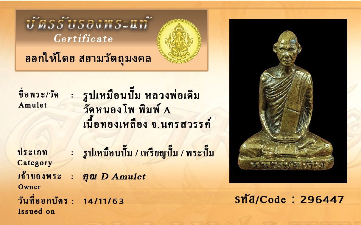 รหัสสินค้า : 296448 รูปเหมือนหลวงพ่อเดิม วัดหนองโพ พิมพ์ A เนื้อทองเหลือง จ.นครสวรรค์