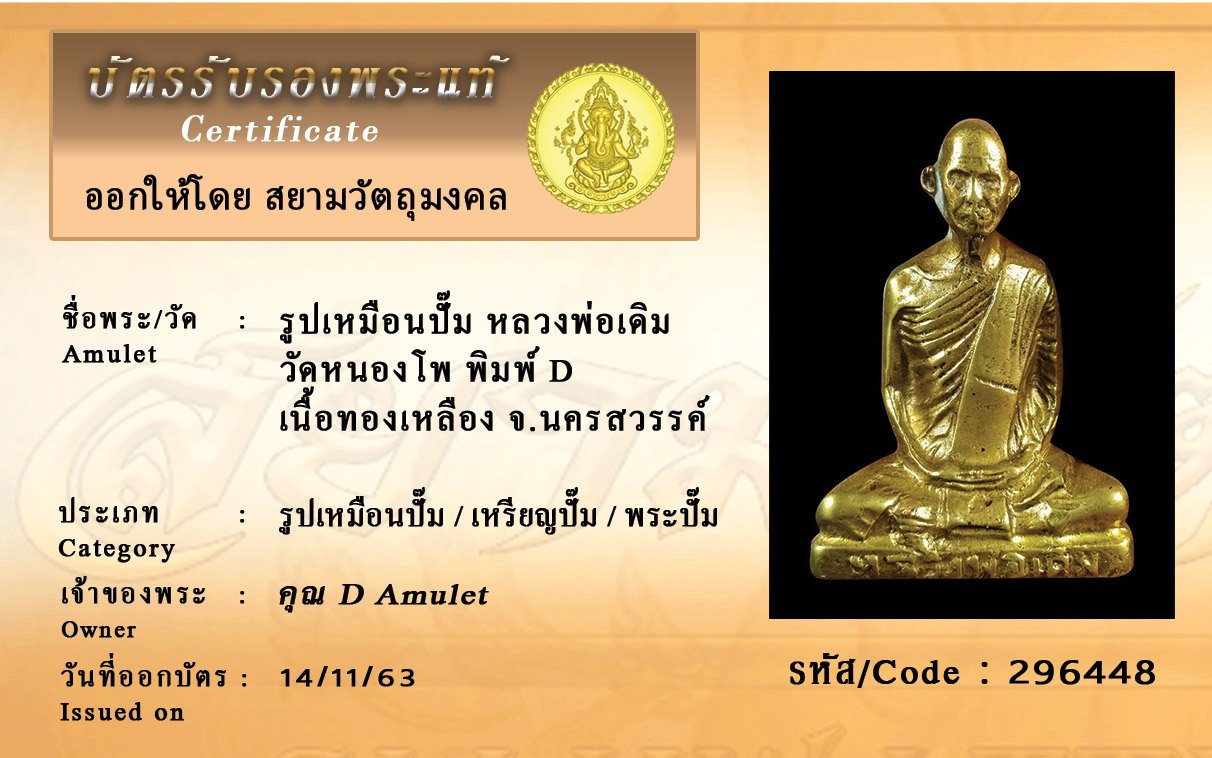 รหัสสินค้า : 296448 รูปเหมือนหลวงพ่อเดิม วัดหนองโพ พิมพ์ D เนื้อทองเหลือง จ.นครสวรรค์