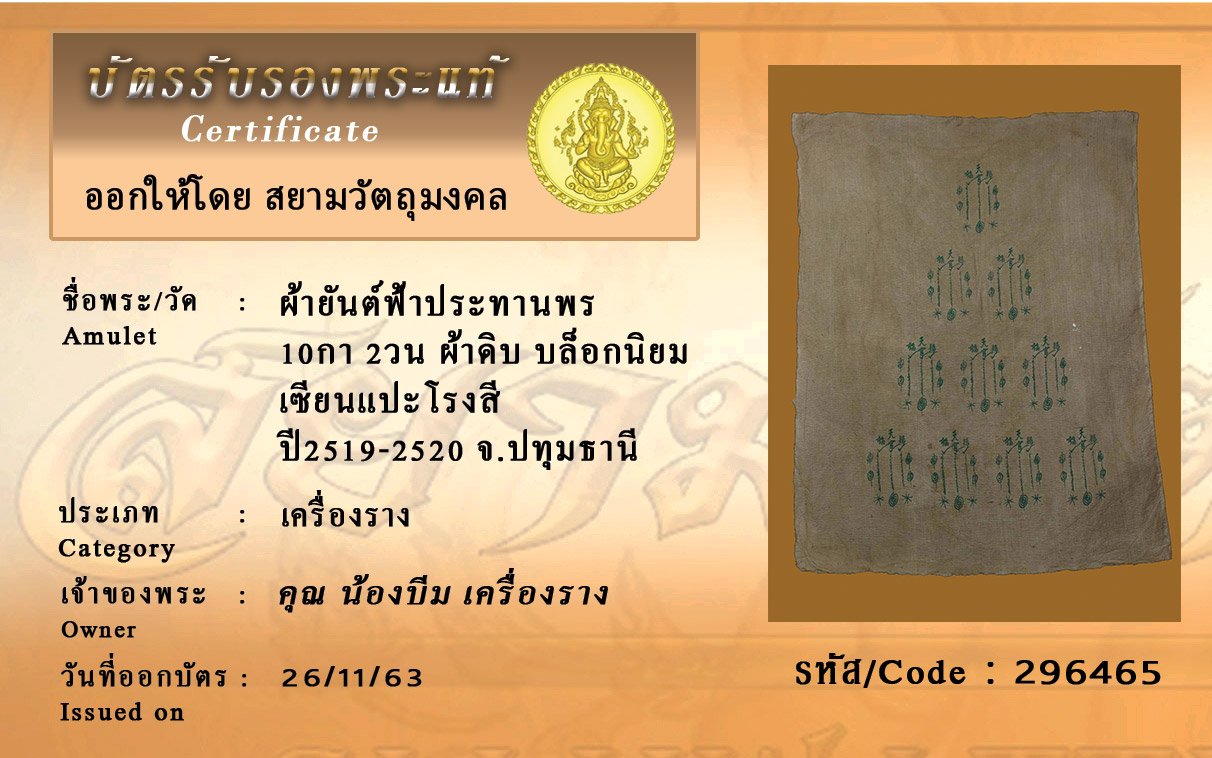 รหัสสินค้า : 296465 ผ้ายันต์ฟ้าประทานพร 10กา 2วน ผ้าดิบ บล็อกนิยม เซียนแปะโรงสี ปี2519-2520 จ.ปทุมธานี