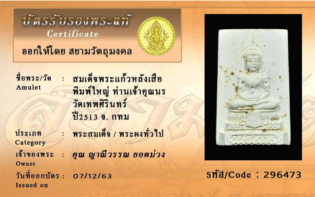 รหัสสินค้า : 296473 สมเด็จพระแก้วหลังเสือ พิมพ์ใหญ่ ท่านเจ้าคุณนร วัดเทพศิรินทร์ ปีพศ 2513 จ.กทม
