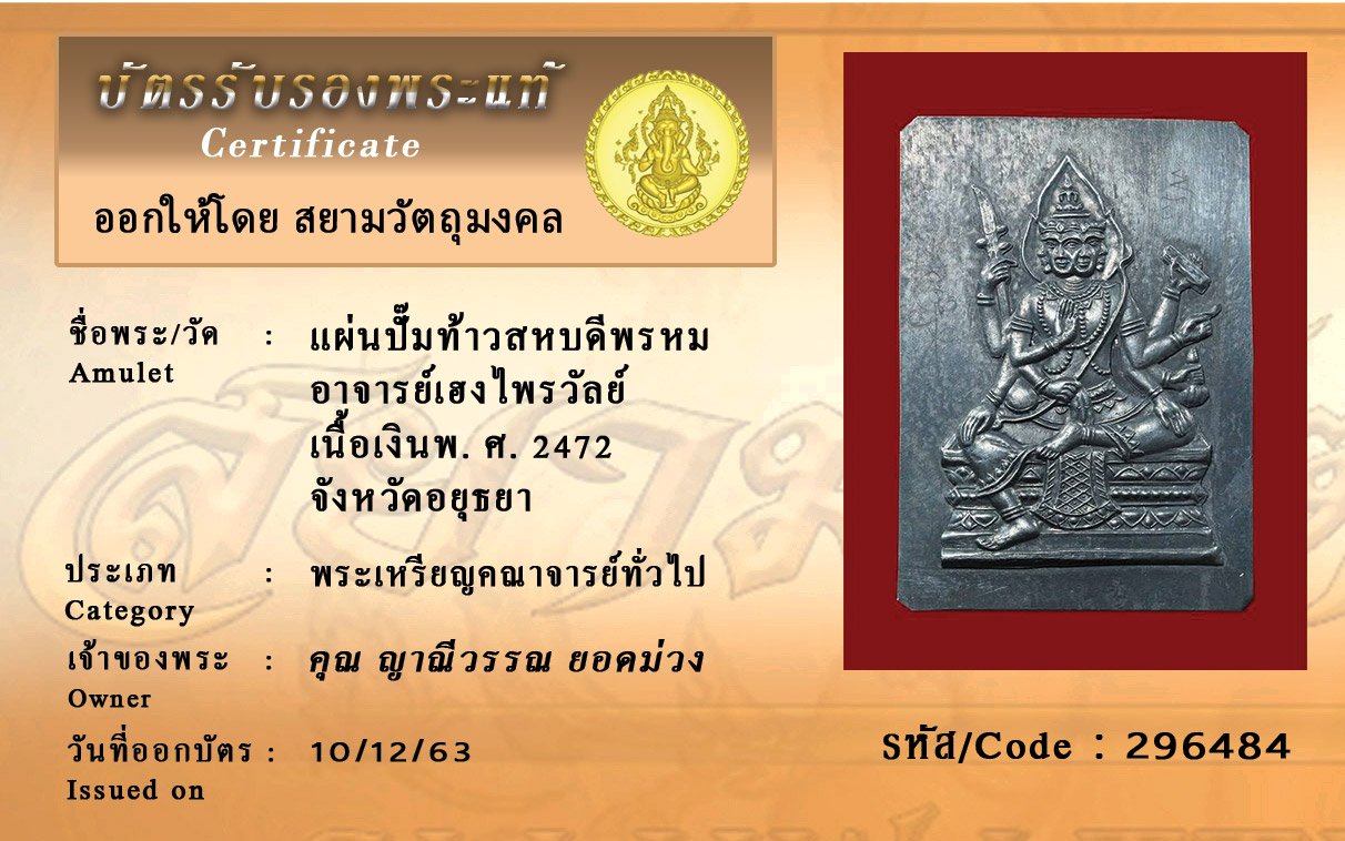 รหัสสินค้า : 296484 แผ่นปั๊มท้าวสหบดีพรหมอาจารย์เฮงไพรวัลย์ เนื้อเงินพ. ศ. 2472 จังหวัดอยุธยา