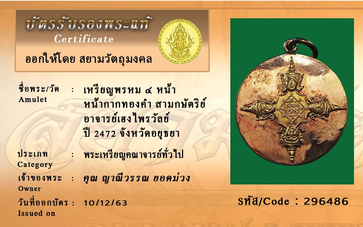 รหัสสินค้า : 296486 เหรียญพรหมสี่หน้า หน้ากากทองคำ สามกษัตริย์ อาจารย์เฮงไพรวัลย์ พ. ศ. 2472 จังหวัดอยุธยา