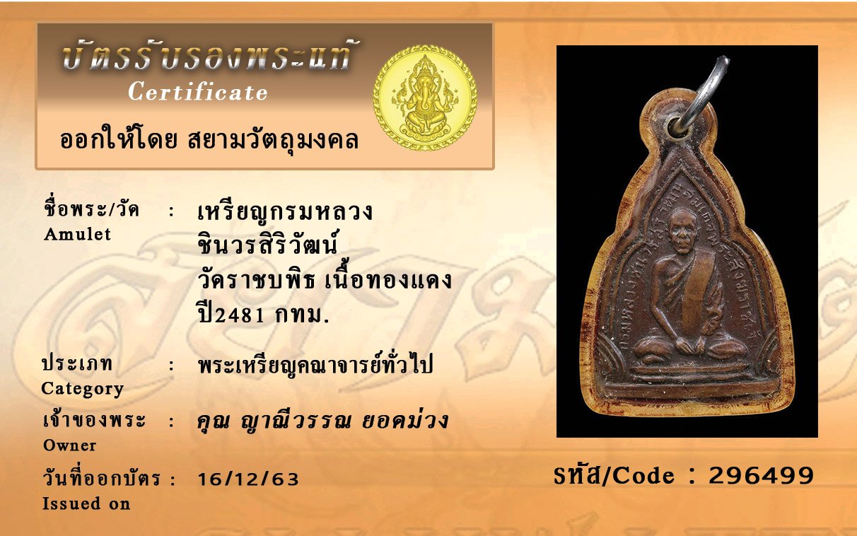 รหัสสินค้า : 296499 เหรียญกรมหลวงชินวรสิริวัฒน์ วัดราชบพิธ เนื้อทองแดง ปี2481 กทม