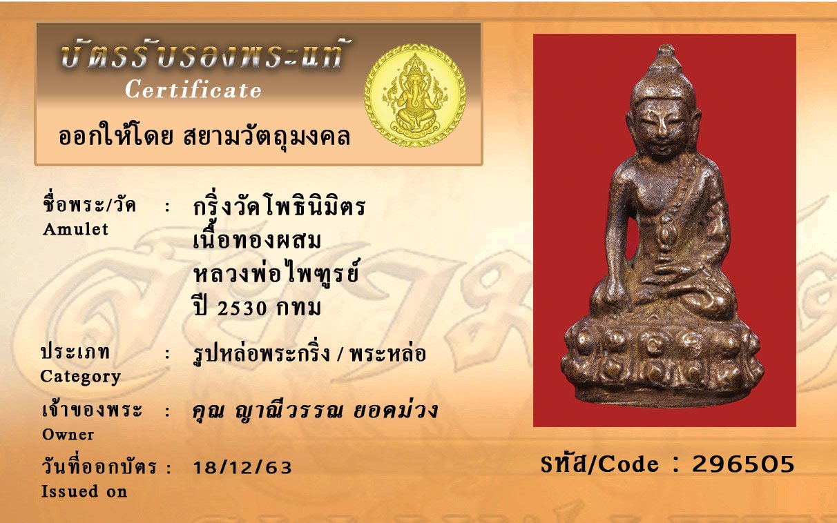 รหัสสินค้า : 296505 กริ่งวัดโพธินิมิตร เนื้อทองผสม หลวงพ่อไพฑูรย์ ปี 2530 กทม