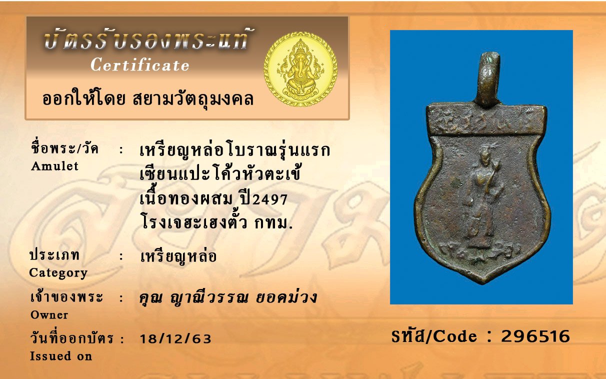 รหัสสินค้า : 296516 เหรียญหล่อโบราณรุ่นแรกเซียนแปะโค้วหัวตะเข้ปีพ.ศ 2497 เนื้อทองผสมโรงเจฮะเฮงตั้วกทม