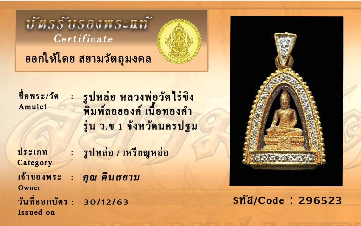 รหัสสินค้า : 296523 รูปหล่อหลวงพ่อวัดไร่ขิง พิมพ์ลอยองค์ เนื้อทองคำ รุ่น ว.ข 1 จังหวัดนครปฐม