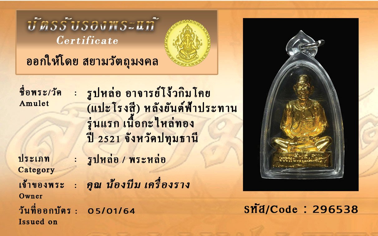 รหัสสินค้า : 296538 รูปหล่ออาจารย์โง้วกิมโคย (แปะโรงสี) หลังยันต์ฟ้าประทาน รุ่นแรก เนื้อกะไหล่ทอง ปี 2521 จังหวัดปทุมธานี