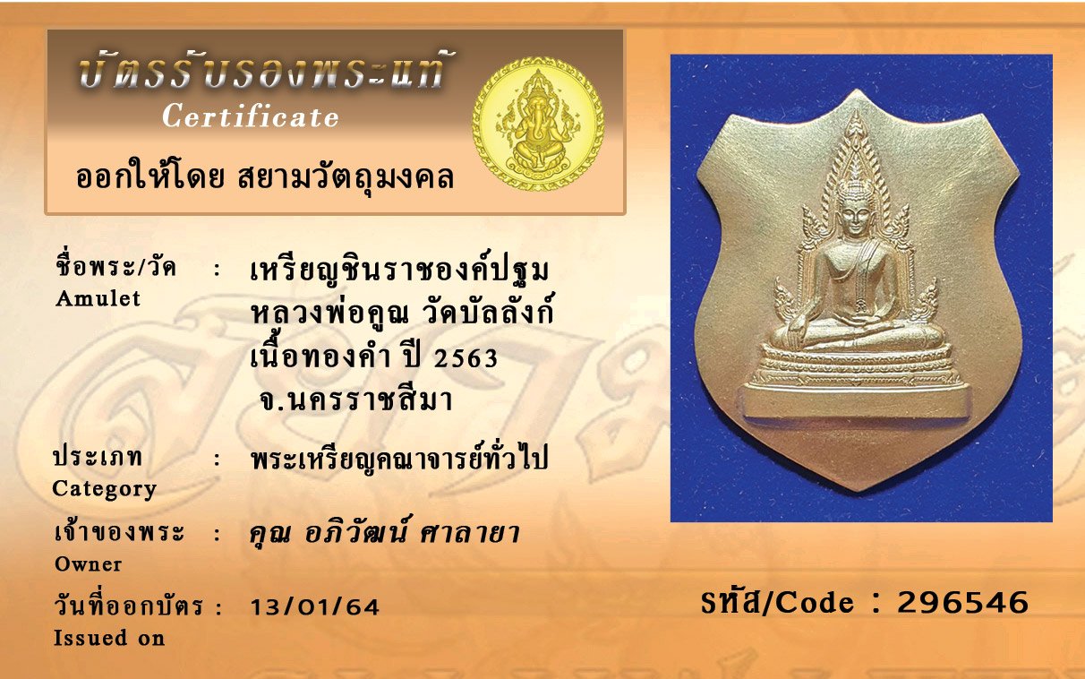 รหัสสินค้า : 296546 เหรียญชินราชองค์ปฐม หลวงพ่อคูณวัดบัลลังก์ เนื้อทองคำ ปี 2563 จ.นครราชสีมา