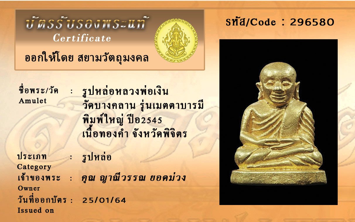 รหัสสินค้า : 296580 รูปหล่อหลวงพ่อเงินวัดบางคลาน รุ่นเมตตาบารมี พิมพ์ใหญ่ ปีพศ 2545 เนื้อทองคำ จังหวัดพิจิตร