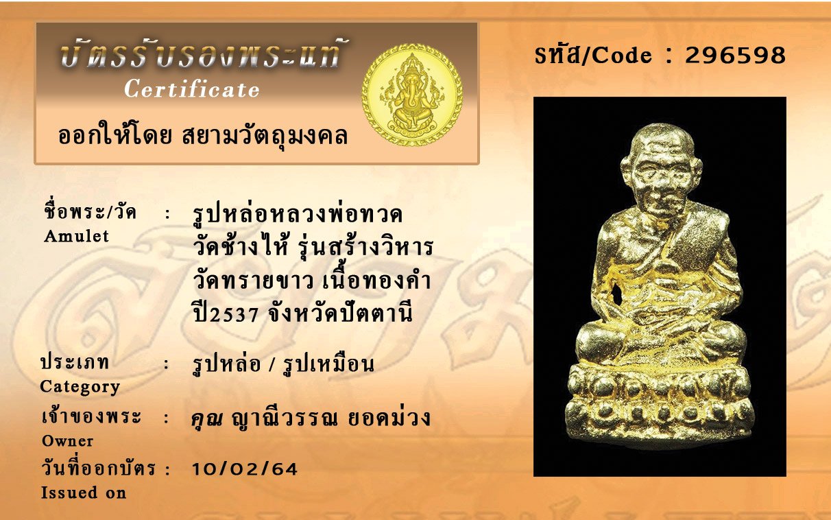 รหัสสินค้า : 296598 รูปหล่อหลวงพ่อทวด วัดช้างไห้รุ่นสร้างวิหารวัดทรายขาวเนื้อทอ งคำ ปี2537 จังหวัดปัตตานี