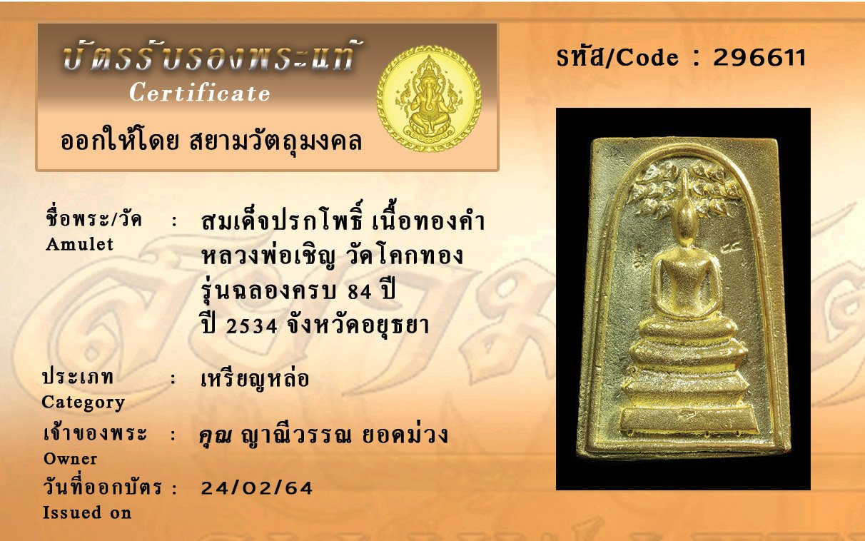 รหัสสินค้า : 296611 สมเด็จปรกโพธิ์ หลวงพ่อเชิญวัดโคกทอง รุ่นฉลองครบ 84 ปี เนื้อทองคำ ปีพศ. 2534 จังหวัดอยุธยา