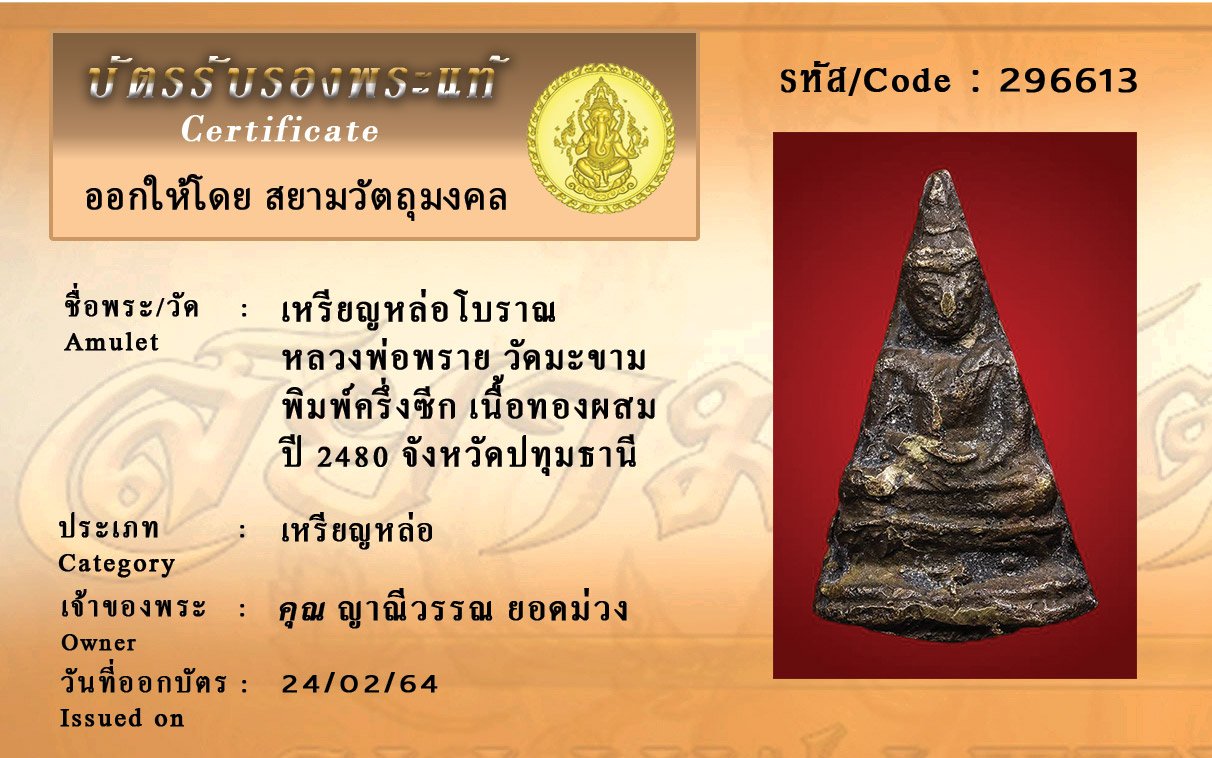 รหัสสินค้า : 296613 เหรียญหล่อโบราณ หลวงพ่อพราย วัดมะขาม พิมพ์ครึ่งซีก ปี 2480 เนื้อทองผสม จังหวัดปทุมธานี