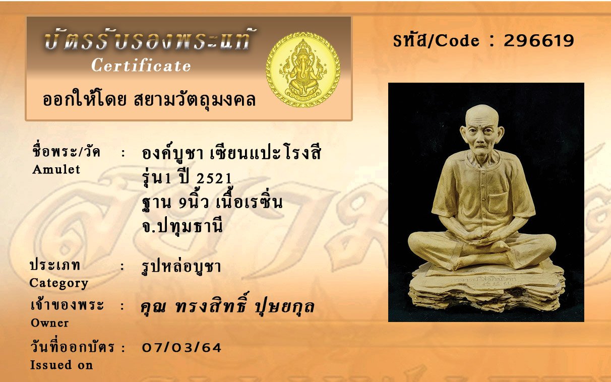 รหัสสินค้า : 296619 องค์บูชา เซียนแปะโรงสี รุ่น1 ปี 2521 ฐาน 9นิ้ว เนื้อเรซิ่น จ.ปทุมธานี