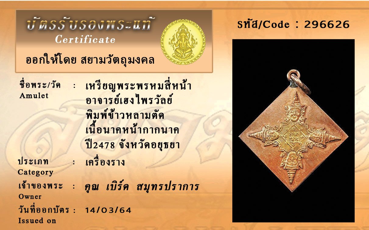รหัสสินค้า : 296626 เหรียญพระพรหมสี่หน้า อาจารย์เฮงไพรวัลย์ พิมพ์ข้าวหลามตัด เนื้อนาคหน้ากากนาค ปี2478 จังหวัดอยุธยา