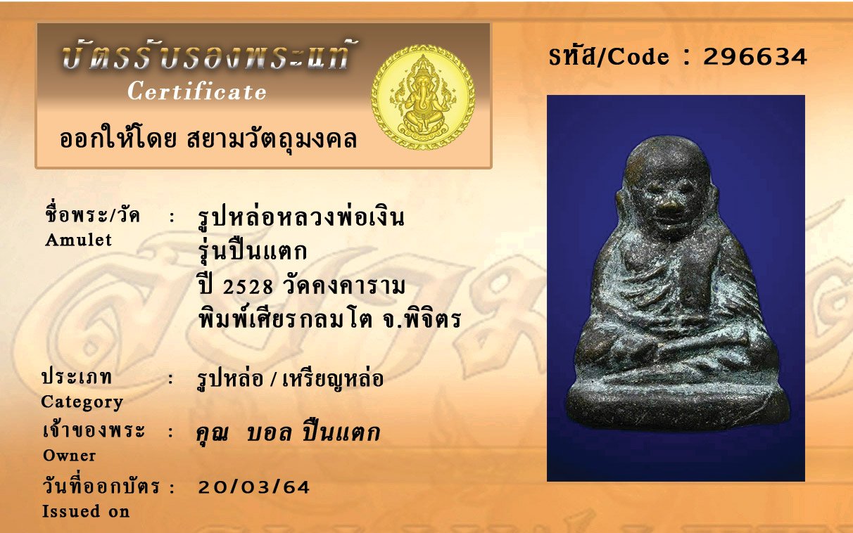 รหัสสินค้า : 296634 รูปหล่อหลวงพ่อเงินรุ่นปืนแตก ปี 2528 วัดคงคาราม พิมพ์เศียรกลมโต จังหวัดพิจิตร