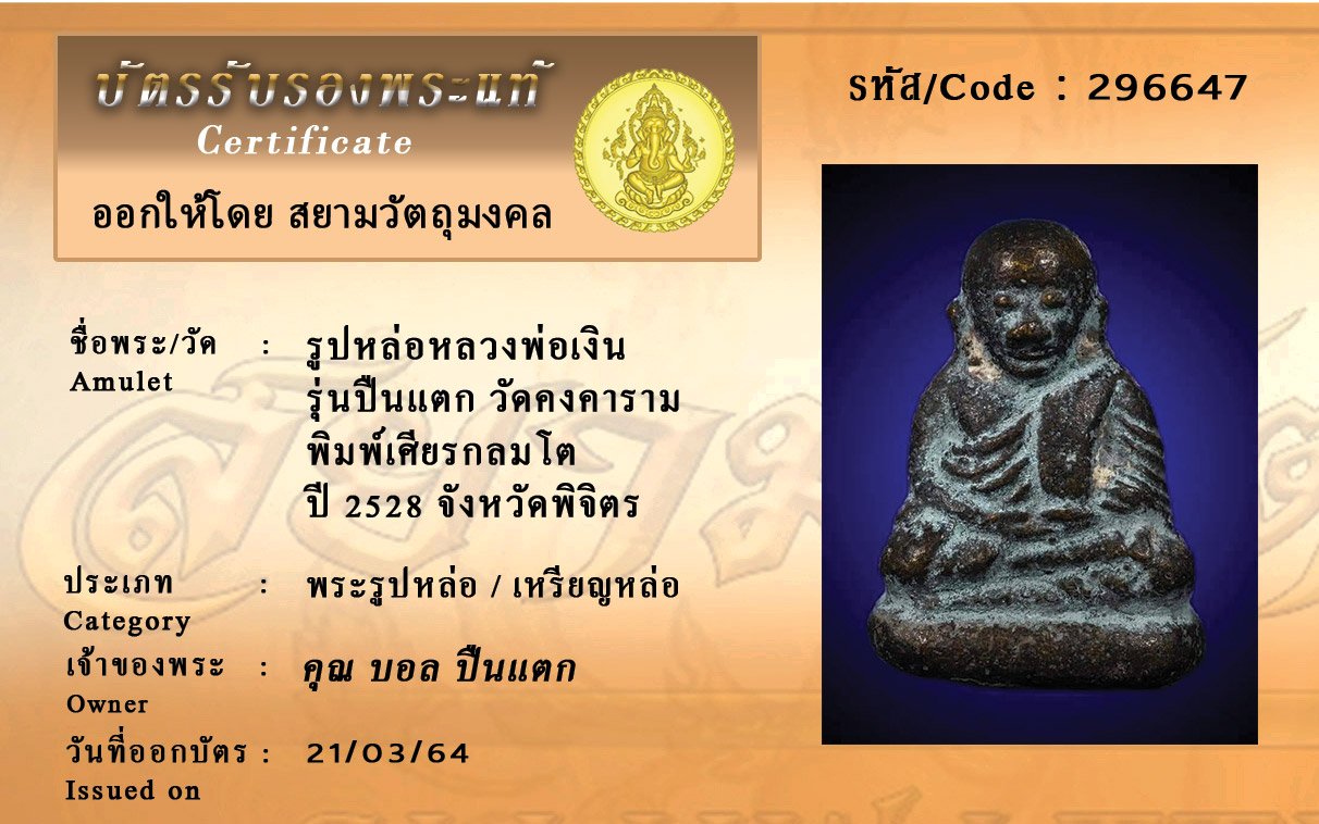 รหัสสินค้า : 296647 รูปหล่อหลวงพ่อเงิน รุ่นปืนแตก วัดคงคาราม พิมพ์เศียรกลมโต ปี 2528 จังหวัดพิจิตร