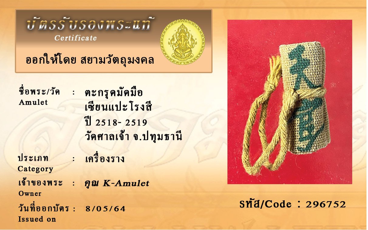 รหัสสินค้า : 296752 ตะกรุดมัดมือ เซียนแปะโรงสี ปี 2518- 2519 วัดศาลเจ้า จ.ปทุมธานี