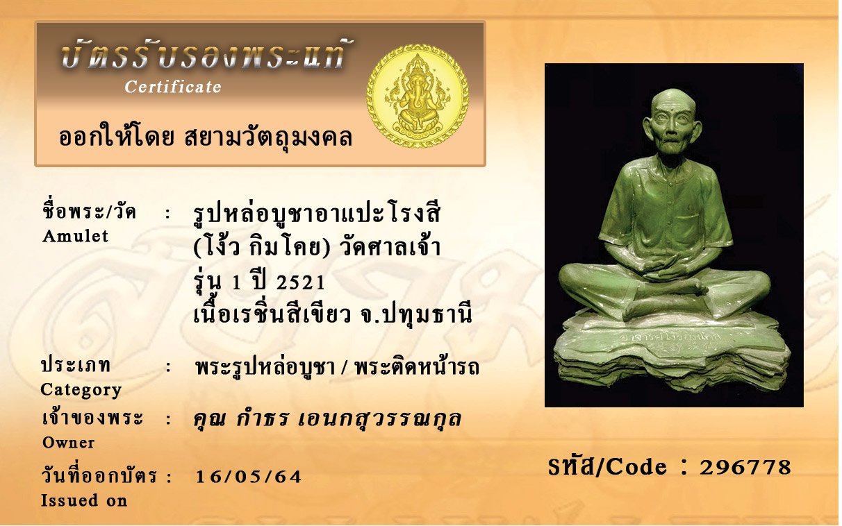 รหัสสินค้า : 296778 รูปหล่อบูชาอาแปะโรงสี (โง้ว กิมโคย) วัดศาลเจ้า รุ่น 1 ปี 2521 เนื้อเรชิ่นสีเขียว จ.ปทุมธานี