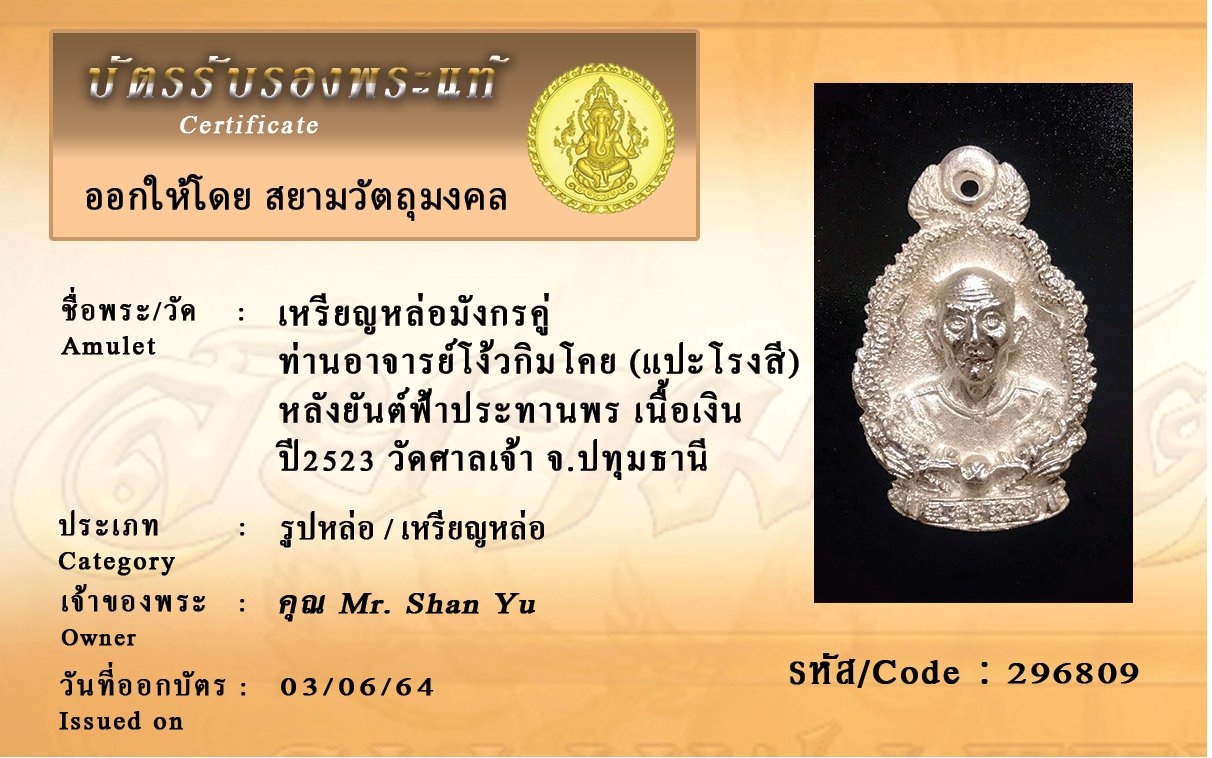 รหัสสินค้า : 296809 เหรียญหล่อมังกรคู่ ท่านอาจารย์โง้วกิมโคย (แปะโรงสี) หลังยันต์ฟ้าประทานพร เนื้อเงิน ปี2523 วัดศาลเจ้า จ.ปทุมธานี