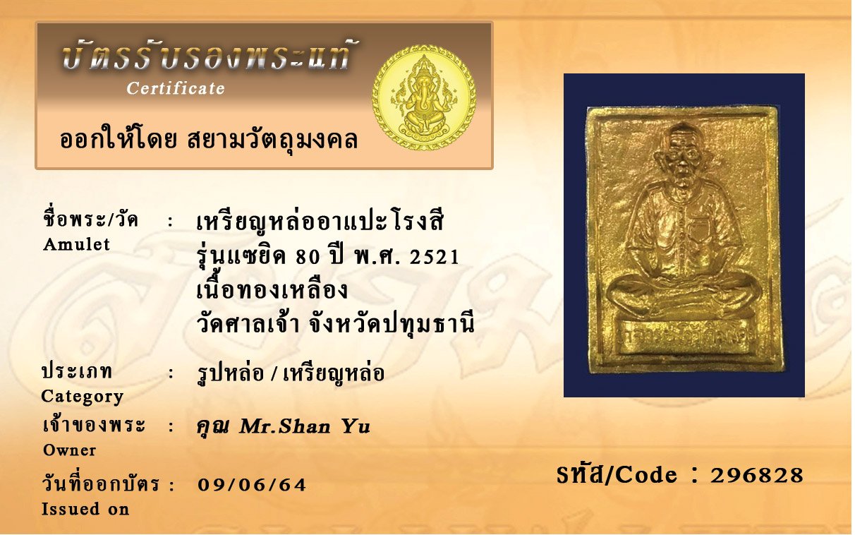 รหัสสินค้า : 296828 เหรียญหล่ออาแปะโรงสี รุ่นแซยิด 80 ปี พ.ศ. 2521 เนื้อทองเหลือง วัดศาลเจ้า จังหวัดปทุมธานี