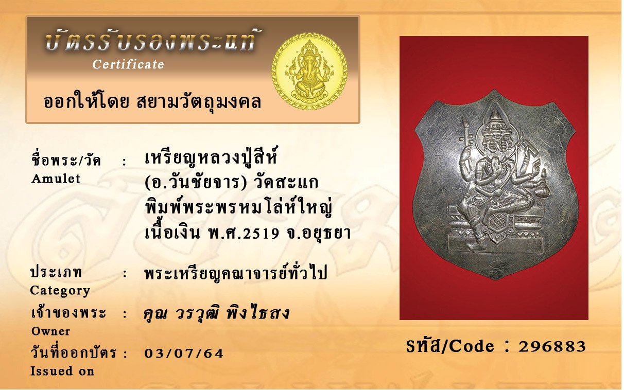 รหัสสินค้า : 296883 เหรียญหลวงปู่สีห์ (อ.วันชันจาร) วัดสะแก พิมพ์พระพรหมโล่ห์ใหญ่ เนื้อเงิน พ.ศ.2519 จ.อยุธยา
