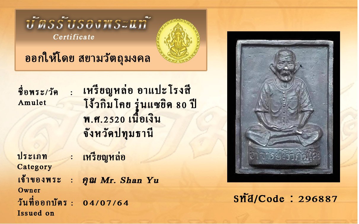 รหัสสินค้า : 296887 เหรียญหล่อ อาแปะโรงสี โง้วกิมโคย รุ่นแซยิด 80 ปี พ.ศ.2520 เนื้อเงิน จังหวัดปทุมธานี