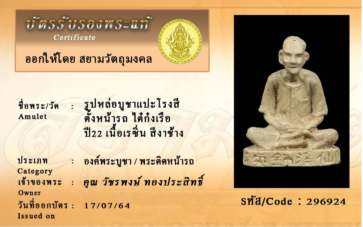 รหัสสินค้า : 296924 รูปหล่อบูชาแปะโรงสี ตั้งหน้ารถ ไต๋ก๋งเรือ ปี22 เนื้อเรซิ่น สีงาช้าง