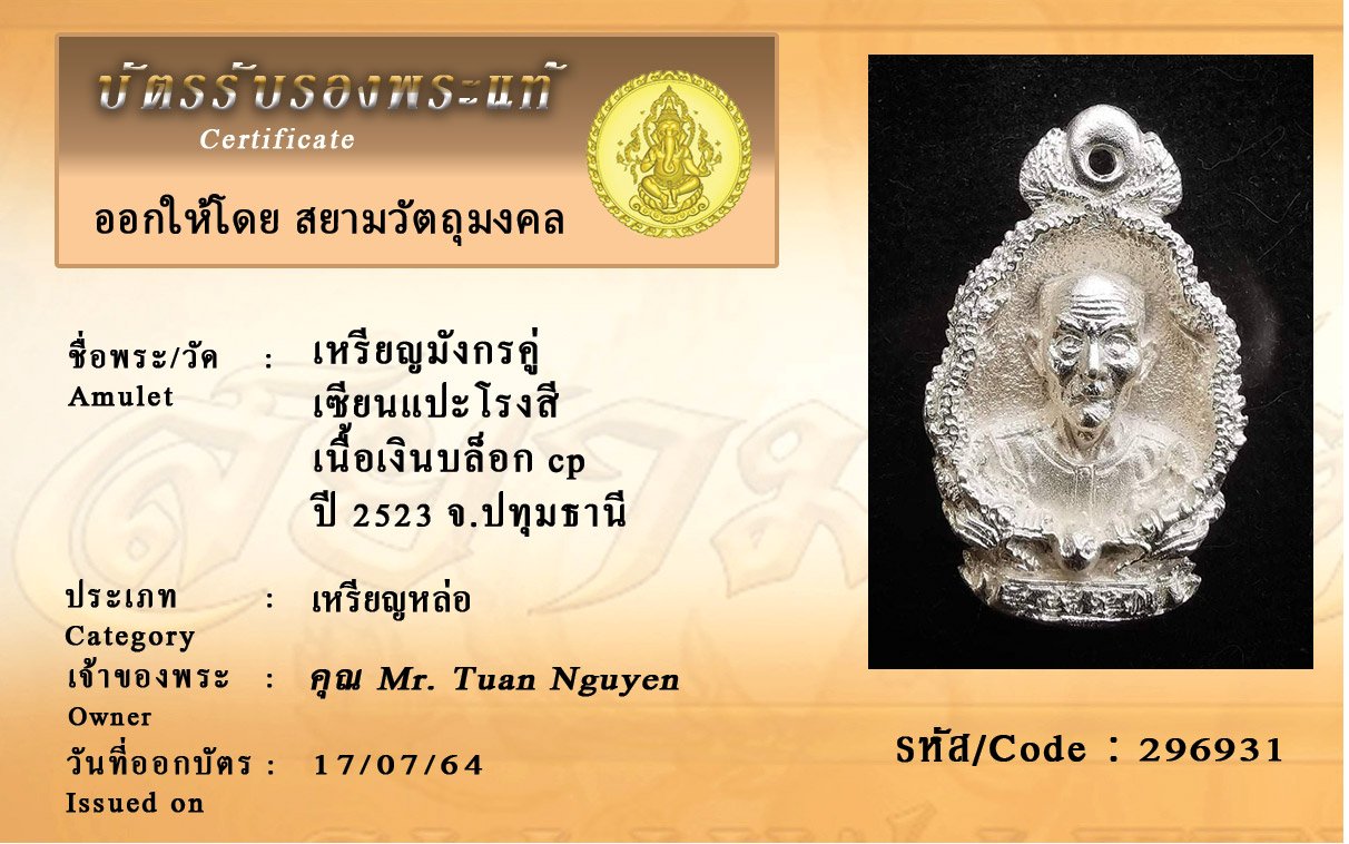 รหัสสินค้า : 296931 เหรียญมังกรคู่ เซียนแปะโรงสี เนื้อเงินบล็อก cp ปี 2523 จ.ปทุมธานี