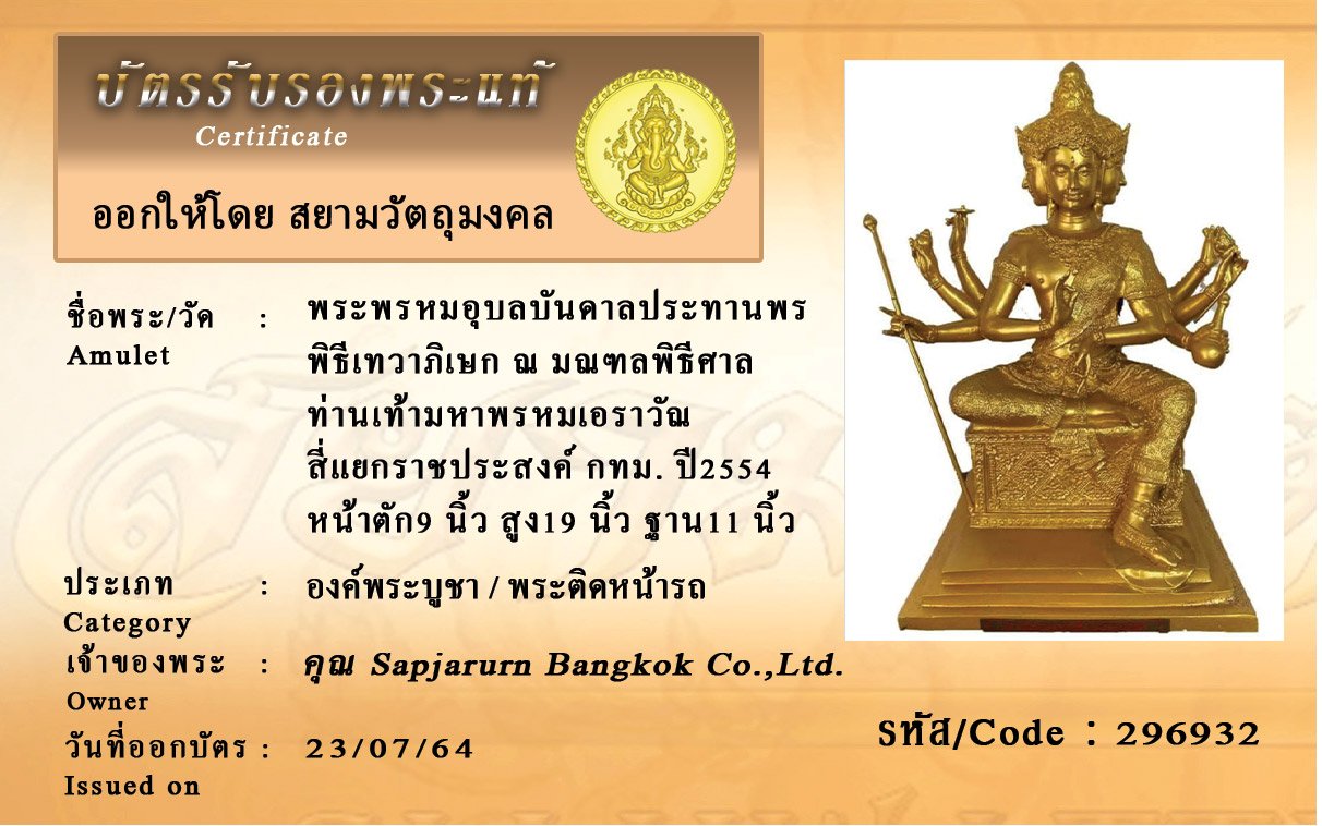 รหัสสินค้า : 296932 พระพรหมอุบลบันดาลประทานพร พิธีเทวาภิเษก ณ มณฑลพิธีศาล ท่านเท้ามหาพรหมเอราวัณ สี่แยกราชประสงค์ กทม. ปี2554 หน้าตัก9 นิ้ว สูง19 นิ้ว ฐาน11 นิ้ว