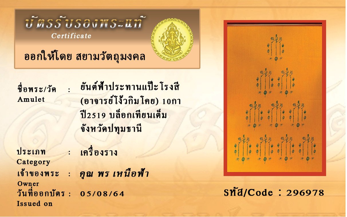 รหัสสินค้า : 296978 ยันต์ฟ้าประทานแป๊ะโรงสี (อาจารย์โง้วกิมโคย) 10กา ปี2519 บล็อกเทียนเต็ม จังหวัดปทุมธานี