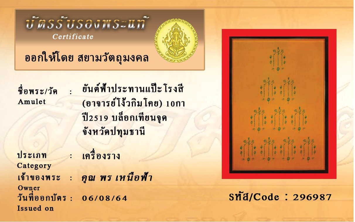 รหัสสินค้า : 296987 ยันต์ฟ้าประทานแป๊ะโรงสี (อาจารย์โง้วกิมโคย) 10กา ปี2519 บล็อกเทียนจุด จังหวัดปทุมธานี