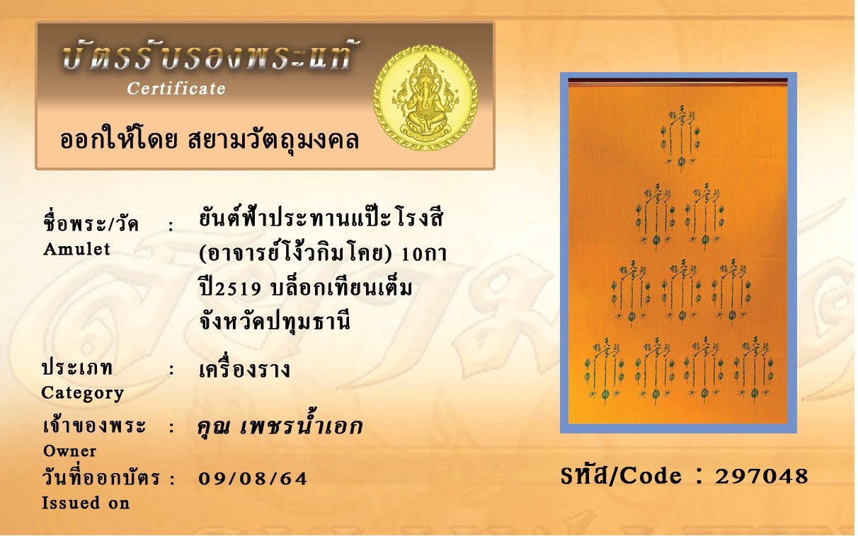 รหัสสินค้า : 297048 ยันต์ฟ้าประทานแป๊ะโรงสี (อาจารย์โง้วกิมโคย) 10กา ปี2519 บล็อกเทียนเต็ม จังหวัดปทุมธานี