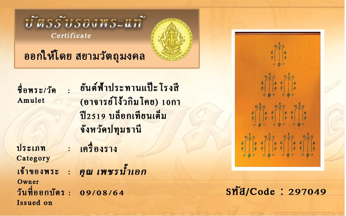 รหัสสินค้า : 297049 ยันต์ฟ้าประทานแป๊ะโรงสี (อาจารย์โง้วกิมโคย) 10กา ปี2519 บล็อกเทียนเต็ม จังหวัดปทุมธานี