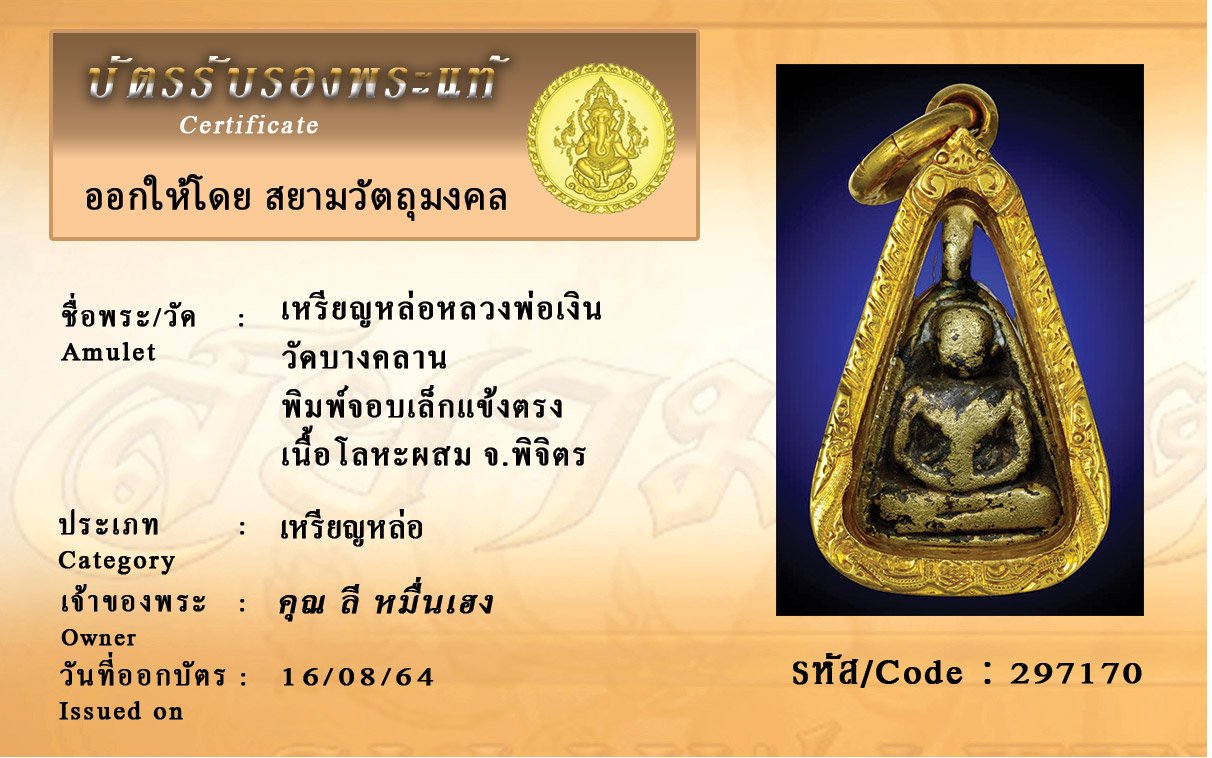 รหัสสินค้า : 297170 เหรียญหล่อหลวงพ่อเงิน วัดบางคลาน พิมพ์จอบเล็กแข้งตรง เนื้อโลหะผสม จ.พิจิตร