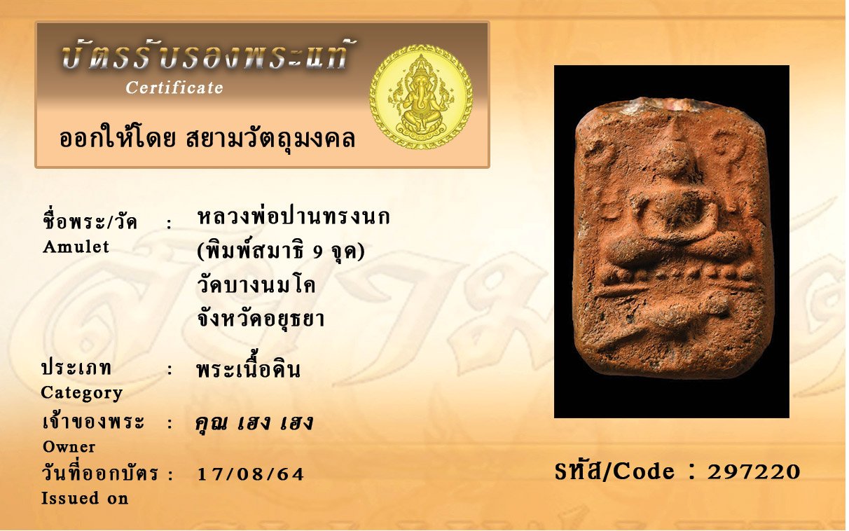 รหัสสินค้า : 297220 หลวงพ่อปานทรงนก (พิมพ์สมาธิ 9 จุด) วัดบางนมโค จังหวัดอยุธยา
