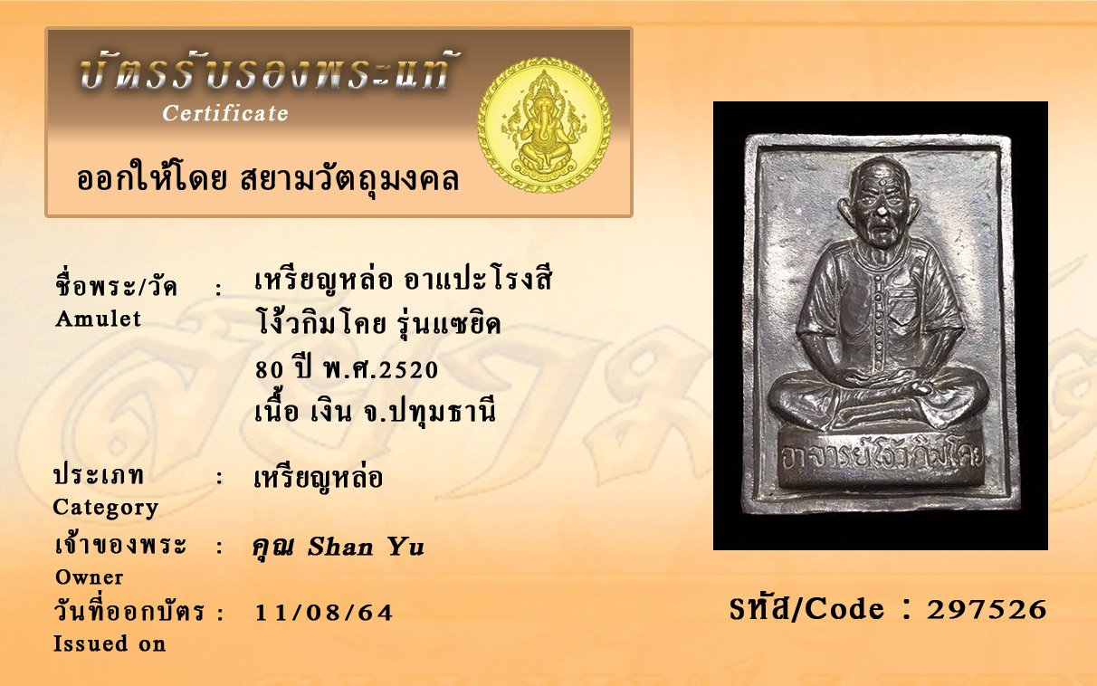 รหัสสินค้า : 297526 เหรียญหล่อ อาแปะโรงสี โง้วกิมโคย รุ่นแซยิด 80 ปี พ.ศ.2520 เนื้อ เงิน จ.ปทุมธานี