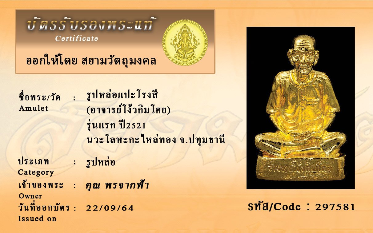 รหัสสินค้า : 297581 รูปหล่อแปะโรงสี (อาจารย์โง้วกิมโคย) รุ่นแรก ปี2521 นวะโลหะกะไหล่ทอง จ.ปทุมธานี