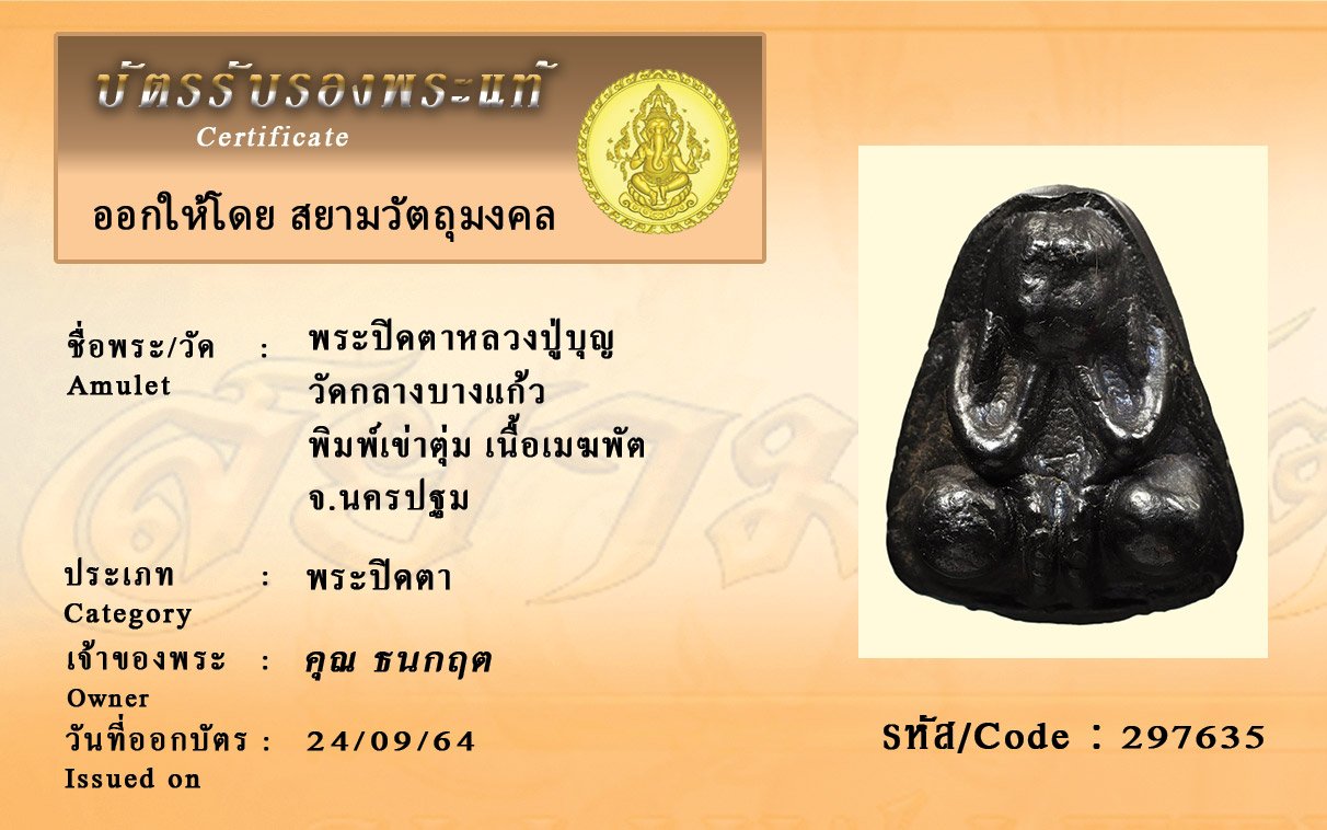 รหัสสินค้า : 297635 พระปิดตาหลวงปู่บุญ วัดกลางบางแก้ว พิมพ์เข่าตุ่ม เนื้อเมฆพัต จ.นครปฐม