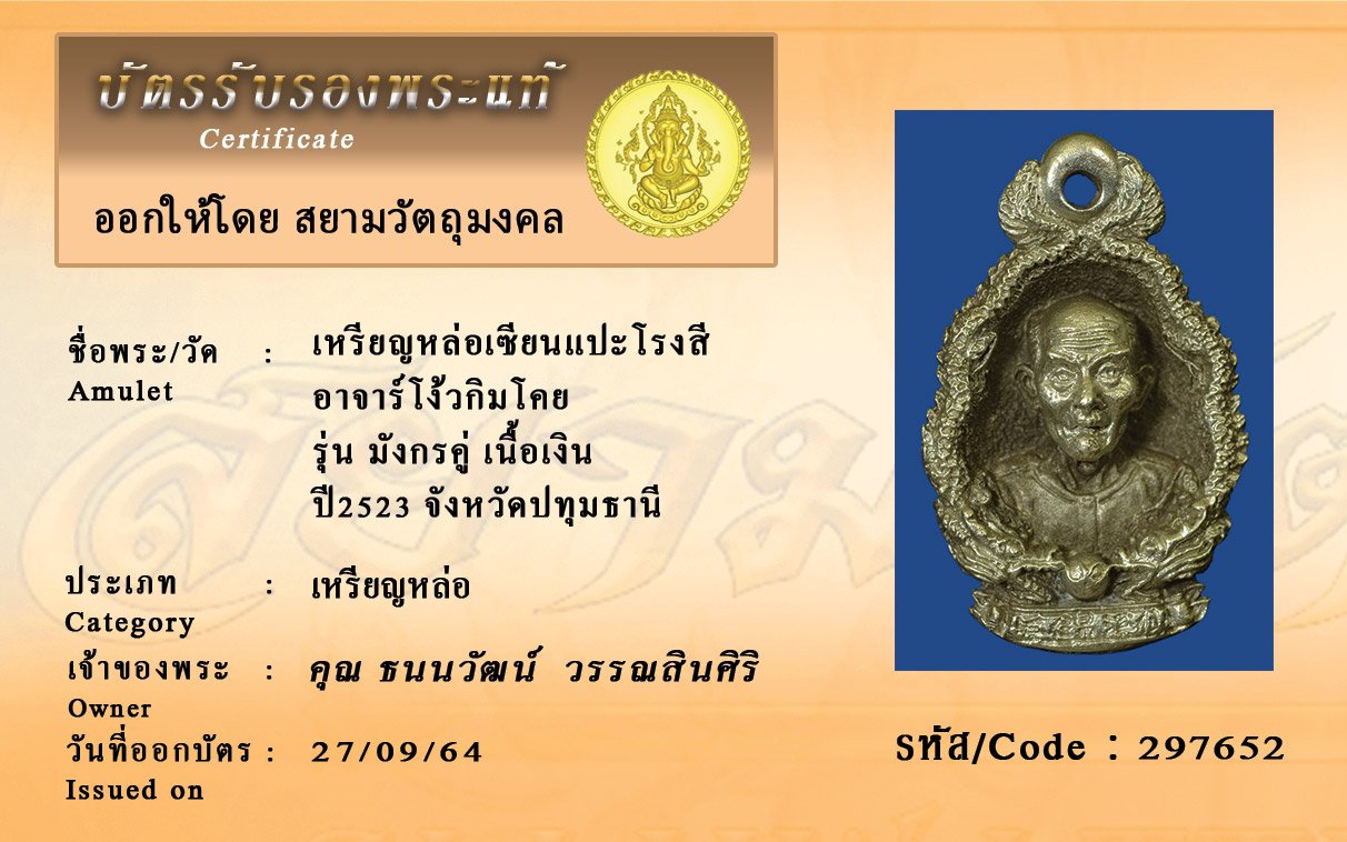 รหัสสินค้า : 297652 เหรียญหล่อเซียนแปะโรงสี อาจาร์โง้วกิมโคย รุ่น มังกรคู่ เนื้อเงิน ปี2523 จังหวัดปทุมธานี