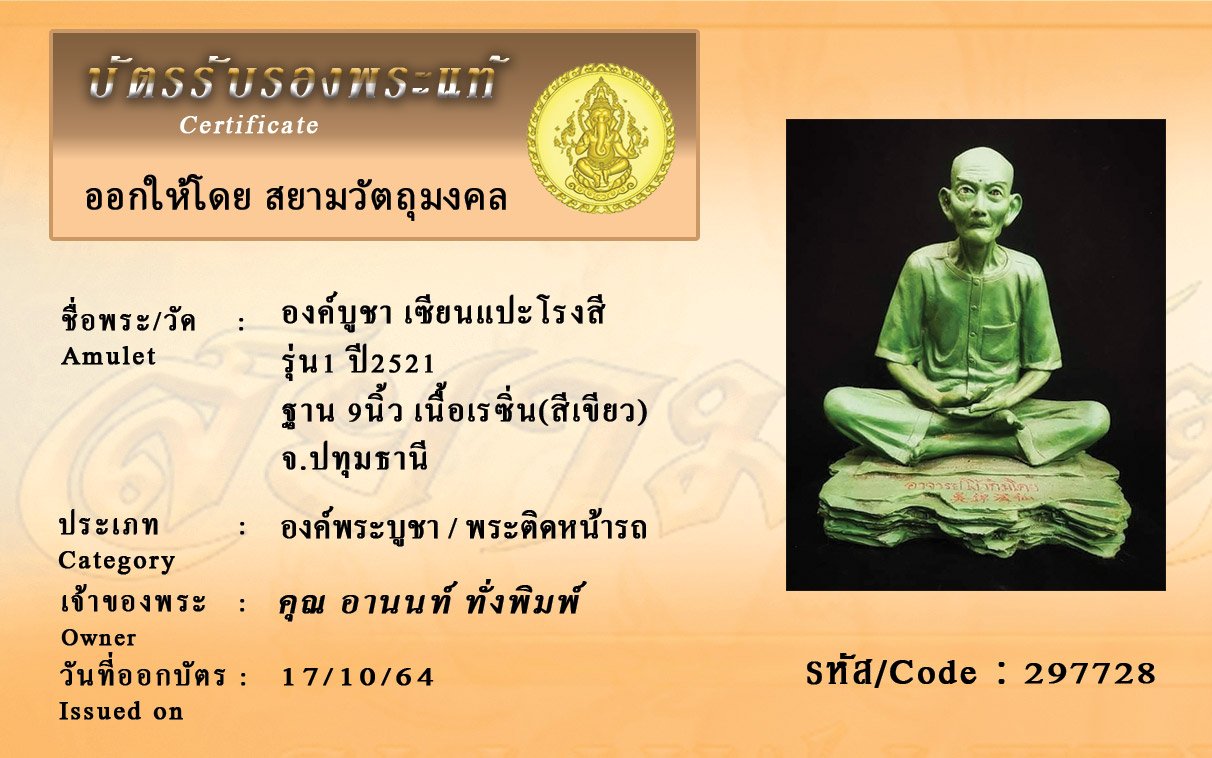 รหัสสินค้า : 297728 องค์บูชา เซียนแปะโรงสี รุ่น1 ปี2521 ฐาน 9นิ้ว เนื้อเรซิ่น(สีเขียว) จ.ปทุมธานี