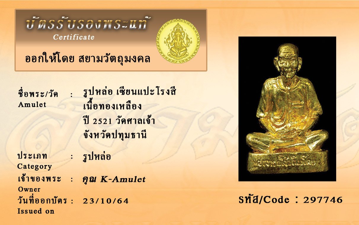รหัสสินค้า : 297746 รูปหล่อ เซียนแปะโรงสี เนื้อทองเหลือง ปี 2521 วัดศาลเจ้า จังหวัดปทุมธานี
