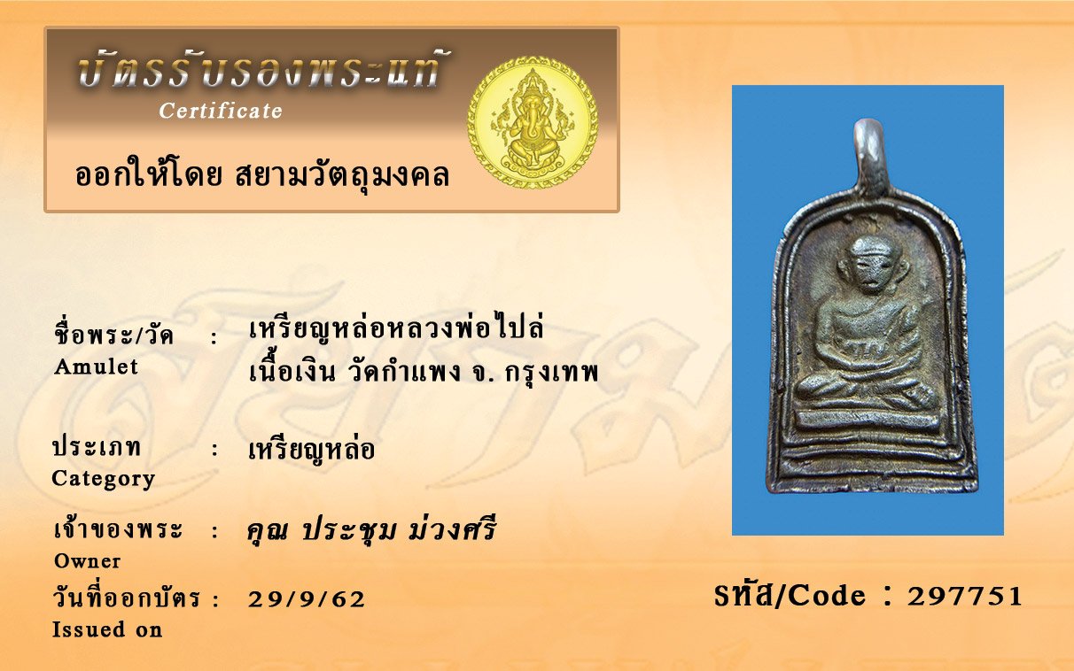 รหัสสินค้า : 297751 เหรียญหล่อหลวงพ่อไปล่เนื้อเงิน วัดกำแพง จ. กรุงเทพ