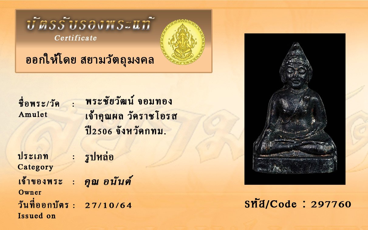 รหัสสินค้า : 297760 พระชัยวัฒน์ จอมทอง เจ้าคุณผล วัดราชโอรส ปี2506 จังหวัดกทม.