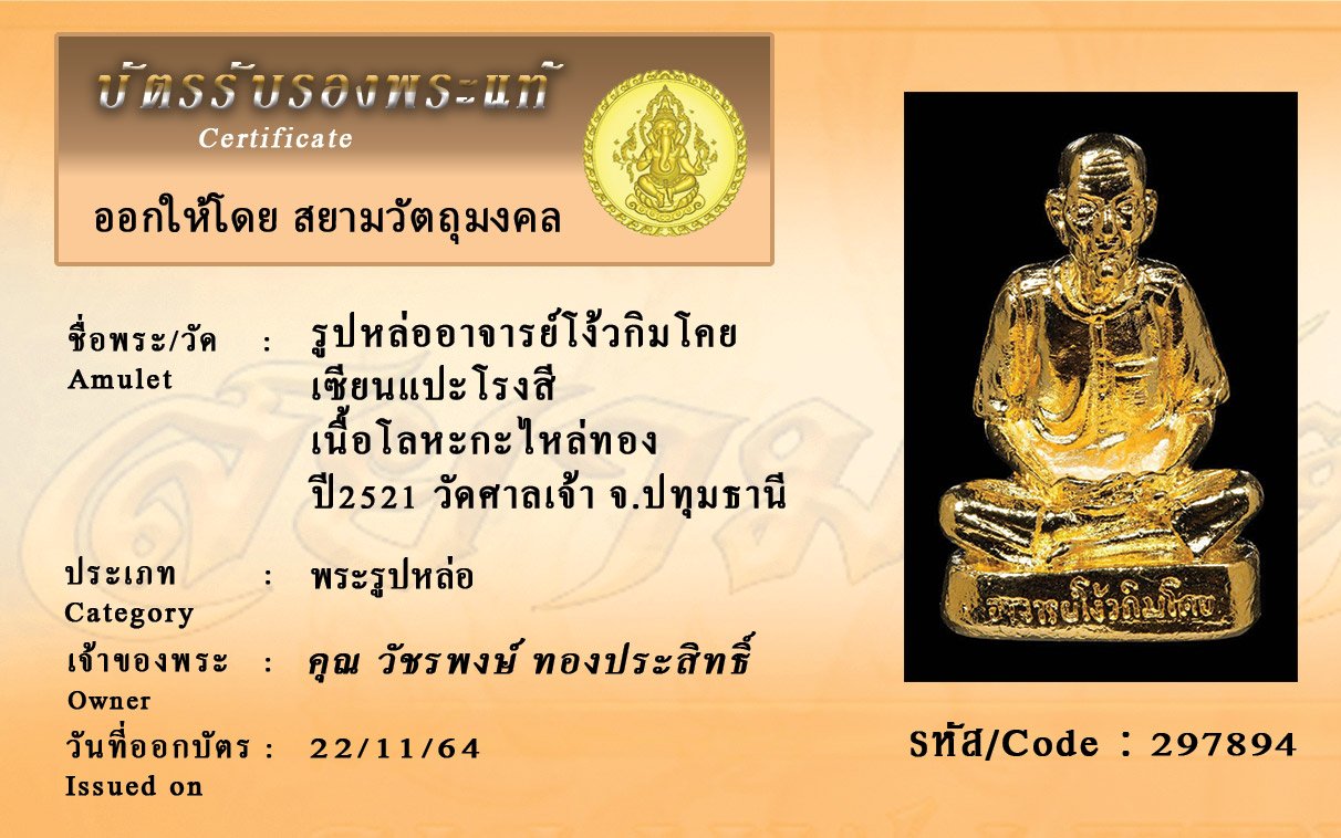 รหัสสินค้า : 297894 รูปหล่ออาจารย์โง้วกิมโคย เซียนแปะโรงสี เนื้อโลหะ กะไหล่ทอง ปี2521 วัดศาลเจ้า จ.ปทุมธานี