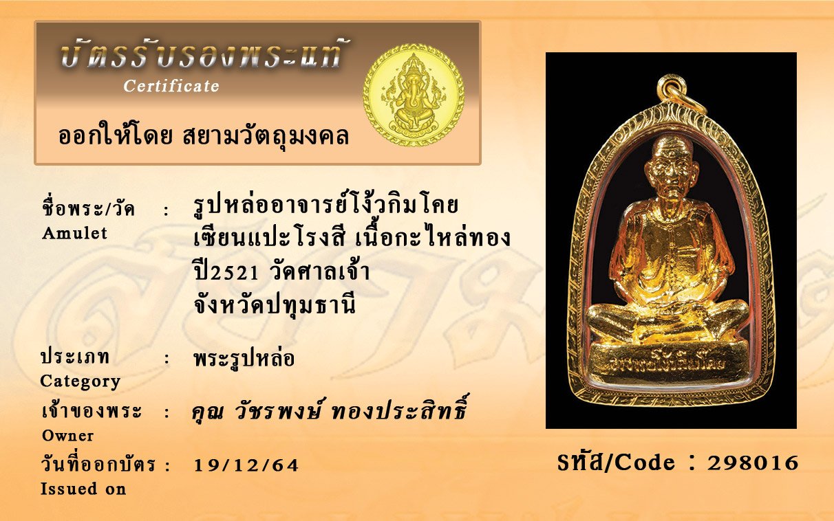 รหัสสินค้า : 298016 รูปหล่ออาจารย์โง้วกิมโคย เซียนแปะโรงสี เนื้อกะไหล่ทอง ปี2521 วัดศาลเจ้า จังหวัดปทุมธานี
