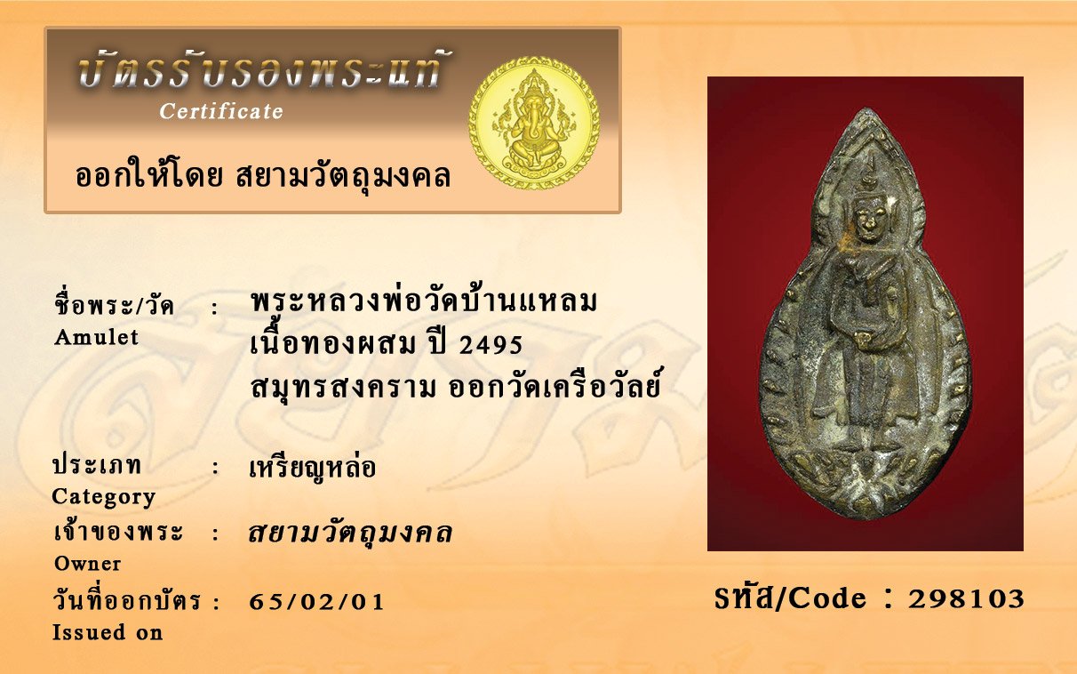 รหัสสินค้า : 298103 พระหลวงพ่อวัดบ้านแหลม เนื้อทองผสม ปี 2495 สมุทรสงคราม ออกวัดเครือวัลย์
