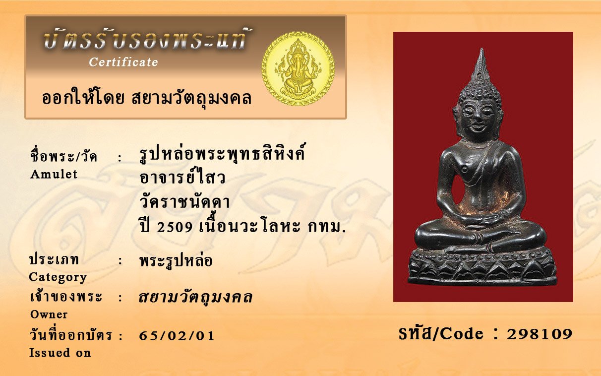รหัสสินค้า : 298109 รูปหล่อพระพุทธสิหิงค์ อาจารย์ไสว วัดราชนัดดา ปี 2509 เนื้อนวะโลหะ กทม.