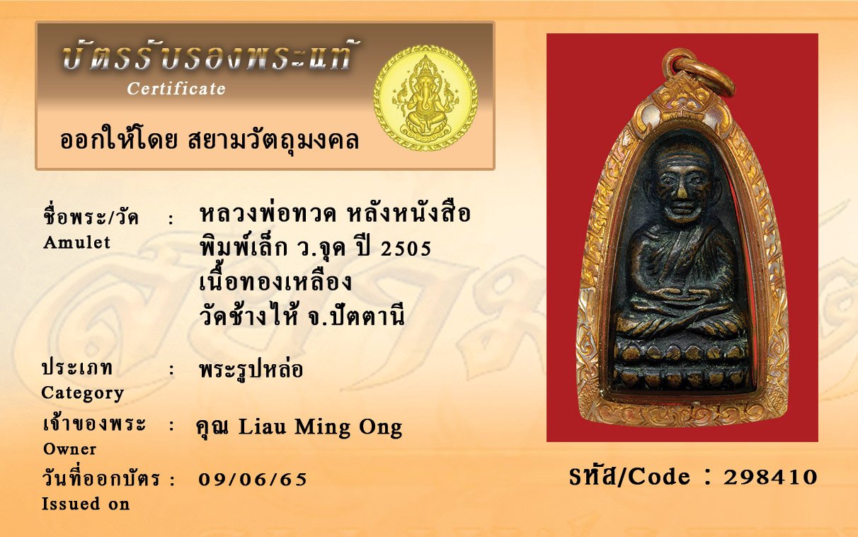 รหัสสินค้า : 298410 หลวงพ่อทวด หลังหนังสือ พิมพ์เล็ก ว.จุด ปี 2505 เนื้อทองเหลือง วัดช้างไห้ จ.ปัตตานี