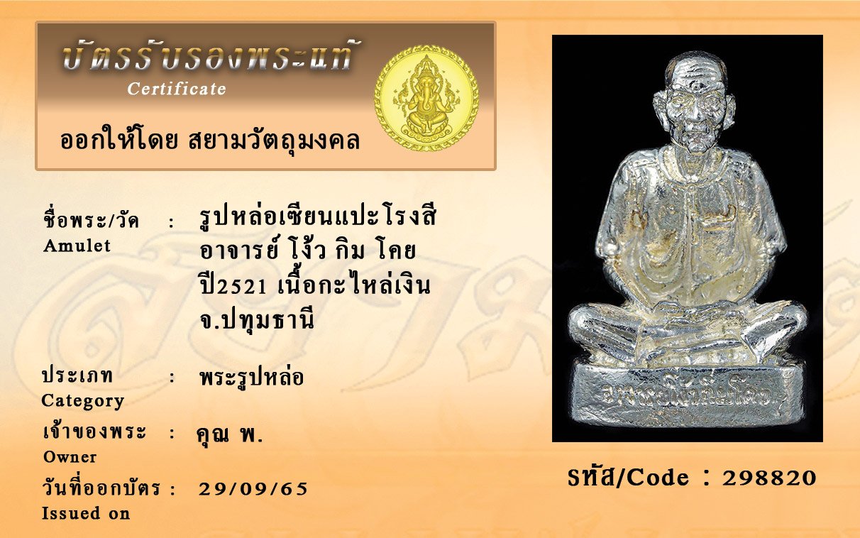 รหัสสินค้า : 298820 รูปหล่อเซียนแปะโรงสี อาจารย์ โง้ว กิม โคย ปี2521 เนื้อกะไหล่เงิน จ.ปทุมธานี